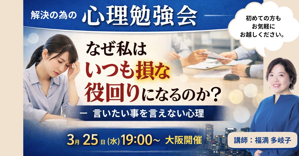 この勉強会では「我慢する人間関係」から抜けていく具体的な心理の理解をお伝えします。