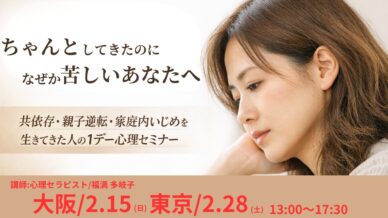 大阪/2月15日(日)&東京/2月28日(土)で心理セミナー開催します。ちゃんとしてきた。空気を読んできた。迷惑をかけないように、期待に応えるように、生きてきた。それなのに――人間関係がしんどい孤独感...